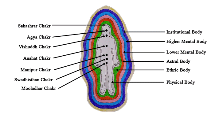 The holistic body is in integration of auric and chakral bodies with physical body. They are subtle and deeply associated with each other. The diagramatic representation is given in this picture.