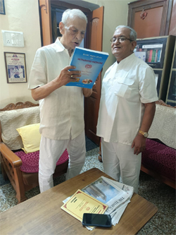 Dr. Nagendra Prasad Dubey, President, World Association of Integrated Medicine (WAIM) offering his First Book of the World “Basic Principles of Integrated Medicine “ to Prof. R H Singh, Former Vice Chancellor, Ayurveda University, Jodhpur; Rajasthan, Former Dean , Faculty of Ayurveda, Institute of Medical Sciences BHU, Varanasi on 10th July 2023. |