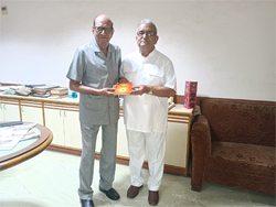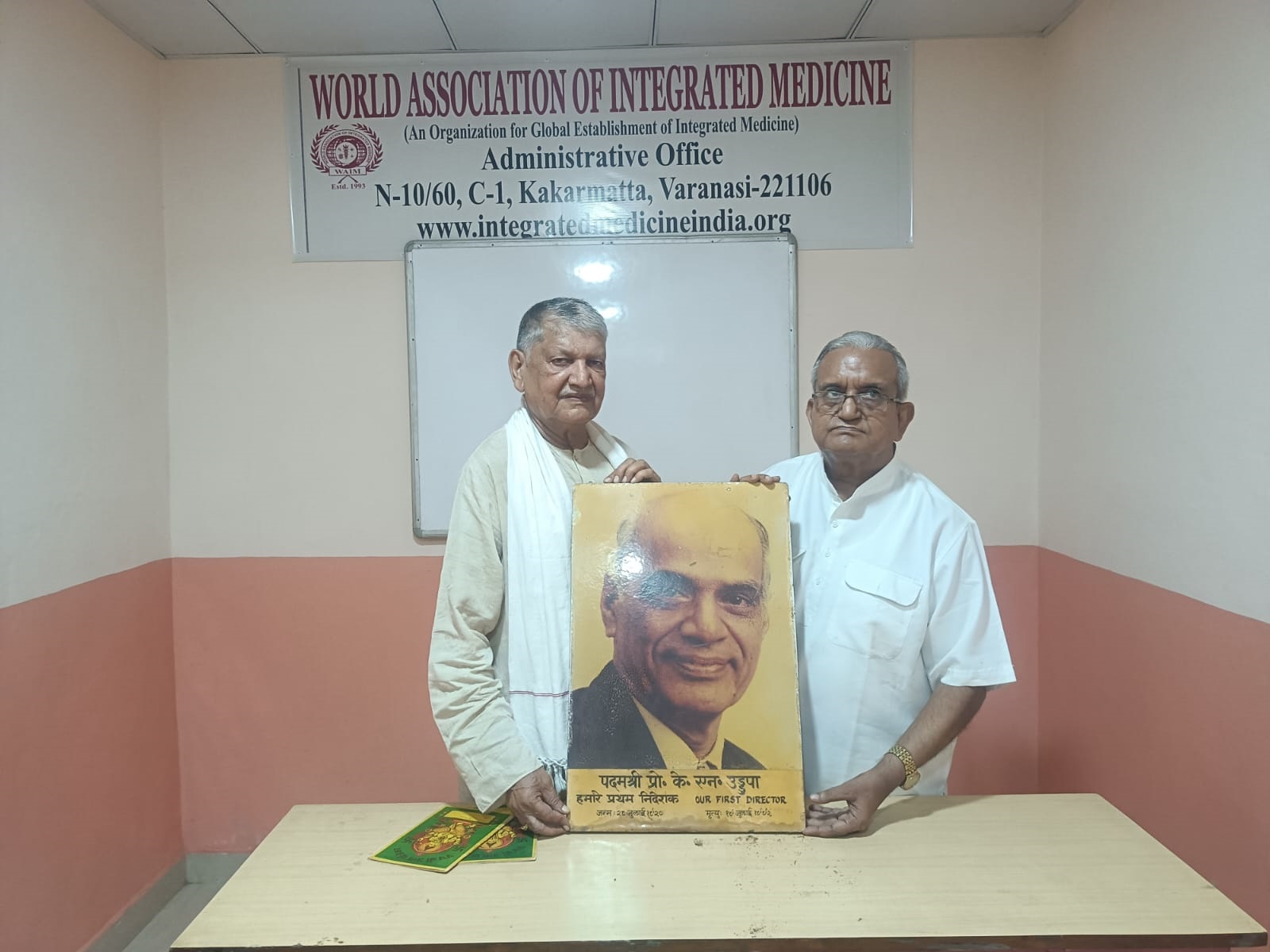 Prof Harikesh Bahadur Singh, Former Vice-Chancellor, Jay Prakash Naraian University Chhapra Bihar is presenting a Photo of Padmshri Prof K N Udupa, Former Founder Director of Institute of Medical Sciences, BHU and Founder Director of Prashanti Medical Care Institute, Varanasi to Dr. Nagendra Prasad Dubey, President, World Association of Integrated Medicine at Administrative Office of WAIM on 20th October 2023. |