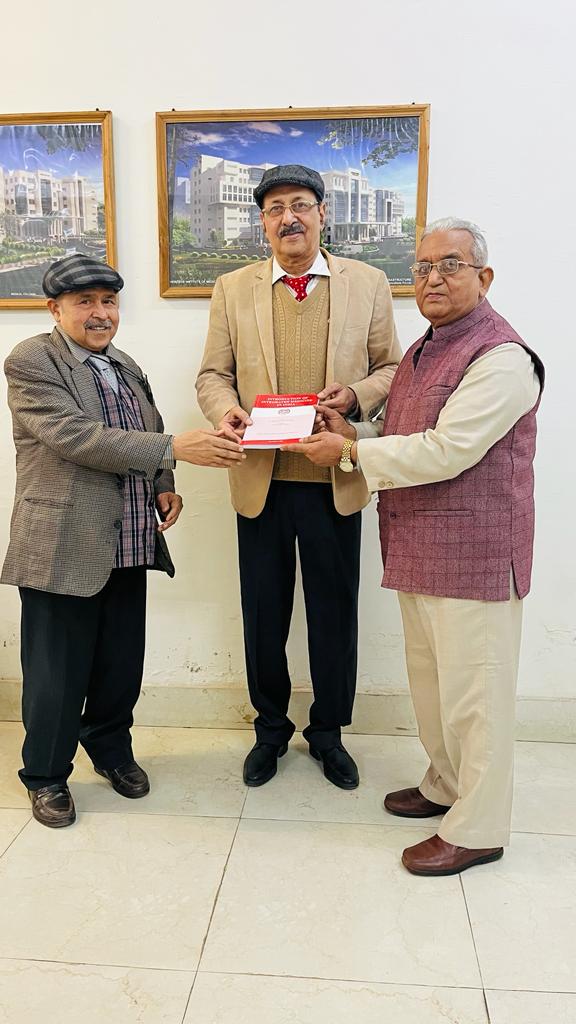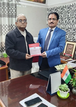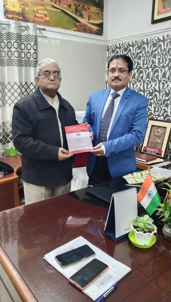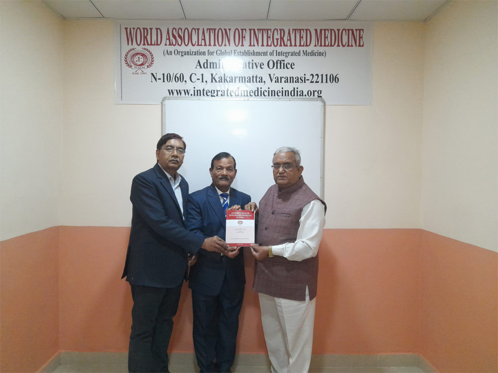 Prof. R G Singh, Former Director, IMS, BHU, Former Principal, IHMS, Varanasi and Fellow of Indian Foundation for Development of Integrated Medicine (IFDIM) and Dr. Nagendra Prasad Dubey, President WAIM and are offering the first book on “Introduction Integrated Medicine in India” to Prof. V.K Mehta, Principal, , Heritage Institute of Medical Sciences , Varanasi on 6th July 2023 in Principal Office of HIMS Varanasi.. |