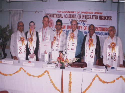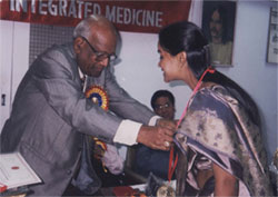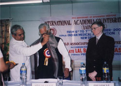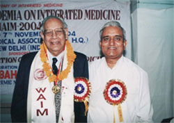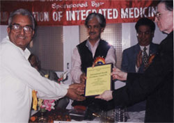 Prof. Mehar Master Moos, President, Zoroastrian College Mumbai, honoring Dr. N.P. Dubey, President WAIM with Gold Medal for Excellence in the Field of Integrated Medicine during the World Congress (January 2001) |