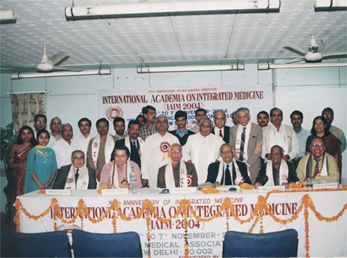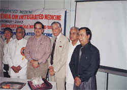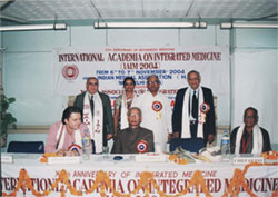 A Galaxy of IAIM 2003 (From L-R) Dr. Happy Tong Chan Wah (Malysiya); Major V. Raizada, Registar WAIM:Shri S.C.Tripathi, Secertary, Elementary Education, Ministry of HRD, Govt. of India:Dr.Diwan Harish Chand; Homeopathic Physician to President of India; Dr.N.P.Dubey, President WAIM and Dr. Iqbal Hassan Mahmood (Bangladesh) |