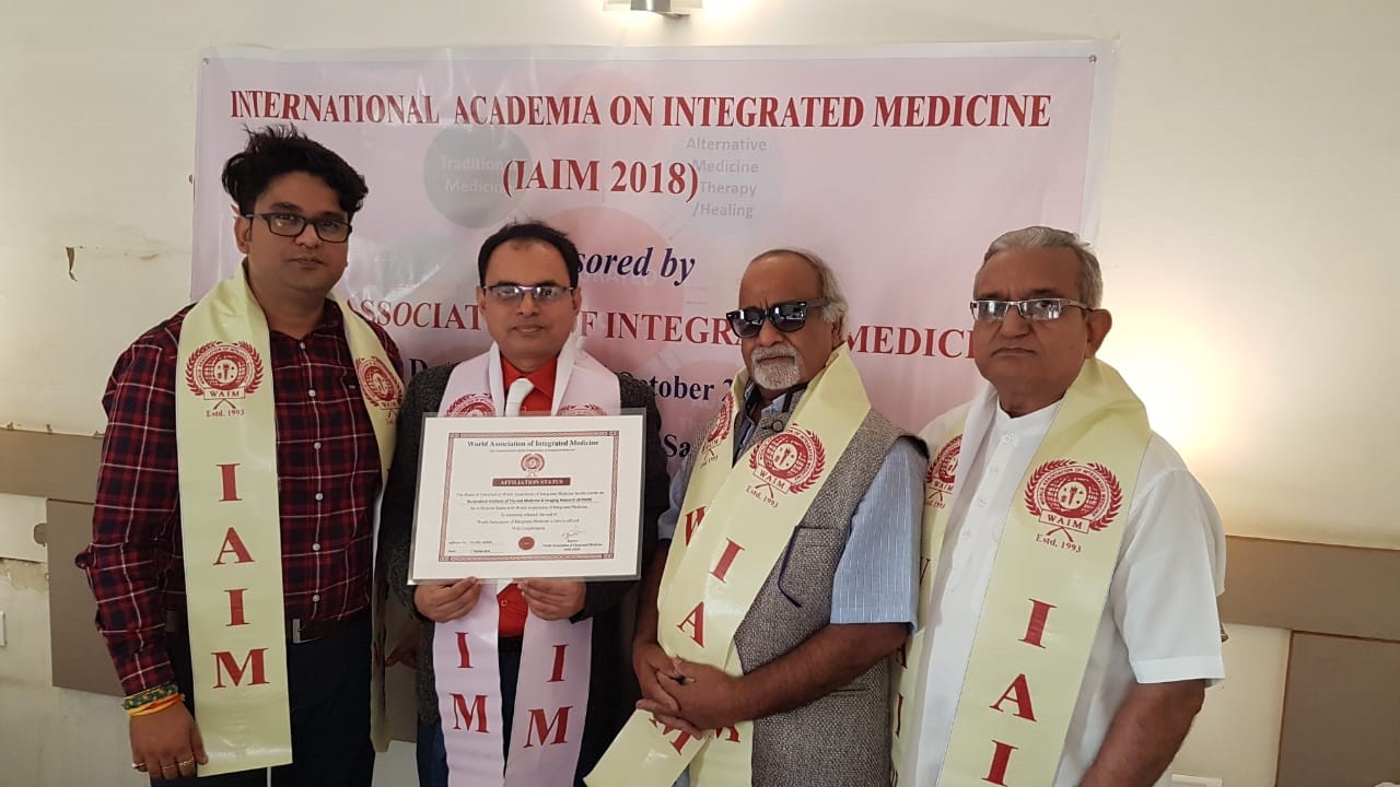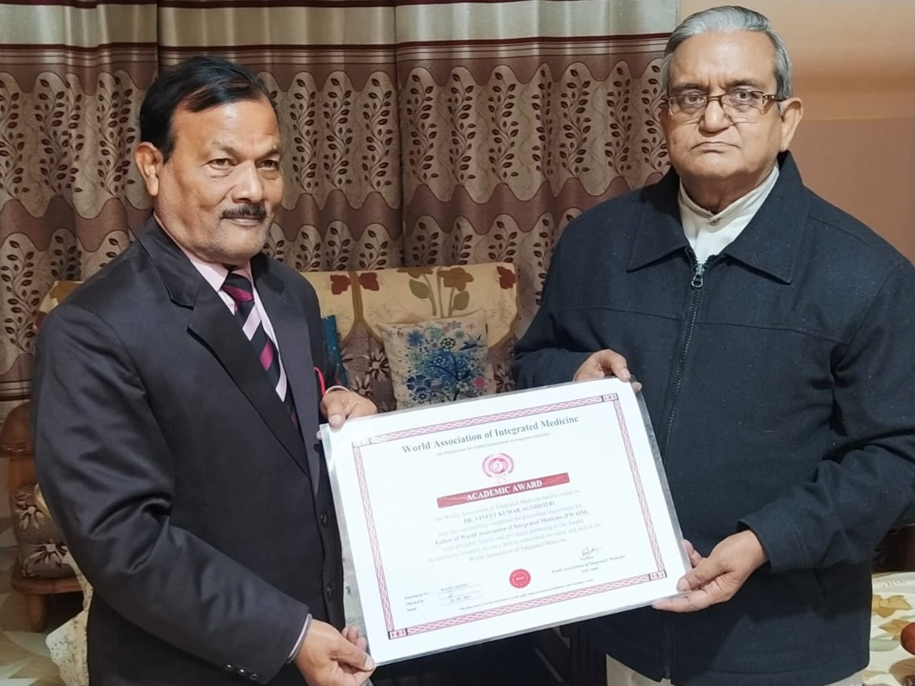Prof. V K Agnihotri, Executive Member of International Integrated Medicine Council (IIMC) is being honoured with Fellowship of World Association of Integrated Medicine (FWAIM) by Dr N P Dubey, President, World Association of Integrated Medicine (FWAIM) at Varanasi on 4th. January 2022.