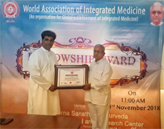 Prof. Swamy A V Srinivasan is being honoured with FWAIM during Fellowship Award Ceremony conducted under the Banner of World Association of Integrated Medicine in the campus of SPS Ayurvedic College at, Neelmangla Taluk, Bangalore November 2018.