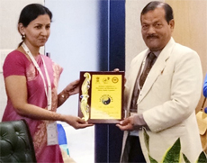 Dr. Namika Dubey is receiving the Gold Medal from the hands Prof. K. Hanumanthappa, Former Vice- Chancellor, Shri Sathy Sai Institute of Higher Learning , Prashanti Nilayam, Anantpur during IMNM-99 |